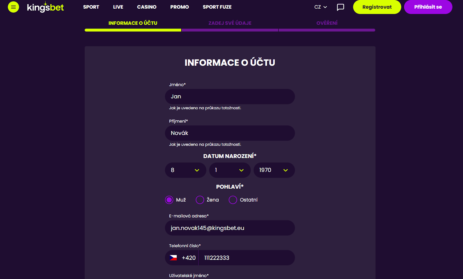 Na hlavní stránce Kingsbet klikni na tlačítko 'Registrace' v pravém horním rohu. Zde vyplníš příslušné informace - tvé jméno, příjmení, datum narození, kontakty atd. Všechny údaje musí být pravdivé!