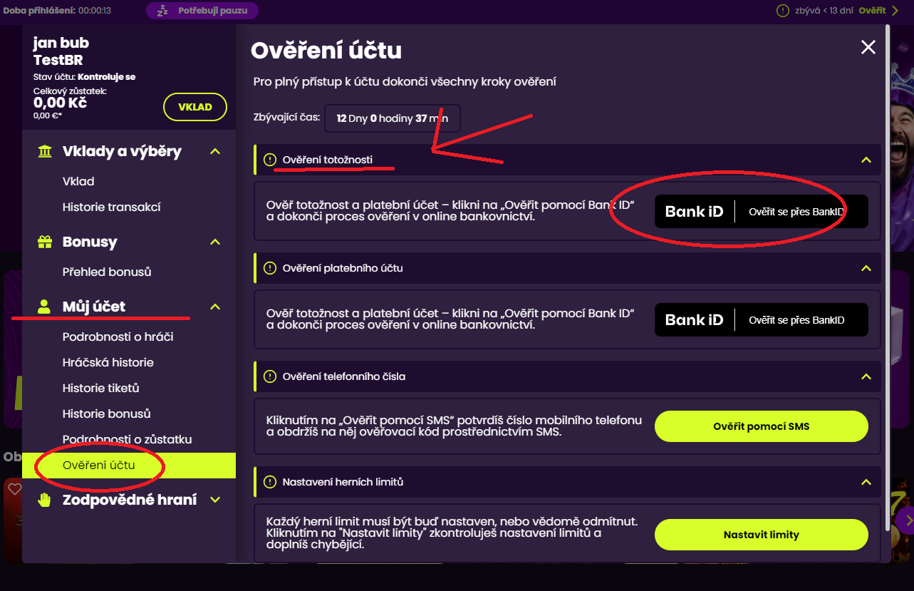 - Zobrazí se ti informace o účtu. Vlevo otevři složku "Můj účet" a klikni na "Ověření účtu". Tady uvidíš všechny kroky, které je nutné splnit. Provádí se přes takzvané Bank ID (Bankovní identita).