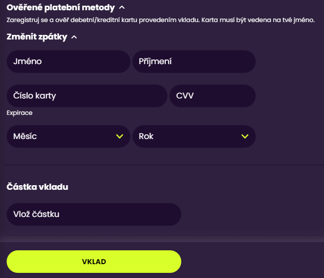 - Klikni na tlačítko "Vklad" a vyber si platební metodu, kterou chceš ověřit.