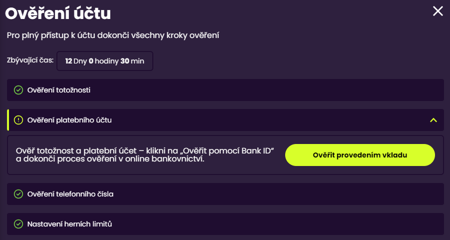 Pokud ne, je třeba ověřit platební metodu pomocí vkladu. To je možné v případě, že máš již splněné všechny ostatní kroky: