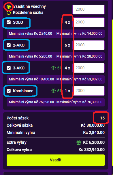 - Tlačítko vsadit na všechny ti umožní vsadit na všechny kombinace stejnou částku, kterou si zvolíš.