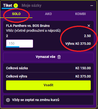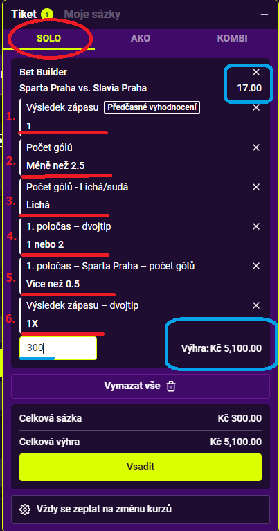 Daný tiket se ti zobrazí jako SOLO sázka, ve skutečnosti máš ale vsazených 6 příležitostí. Na tiketu můžeš mít až 7 příležitostí, ale poté si musíš vybrat jednu, kterou odstraníš, aby bylo možné daný tiket vsadit.