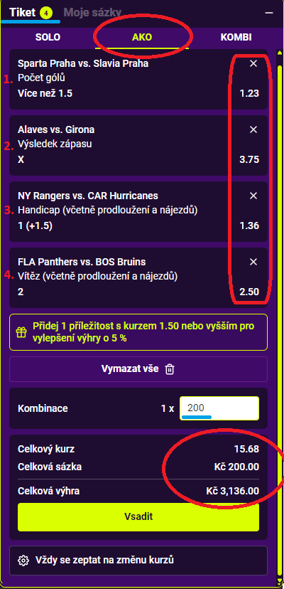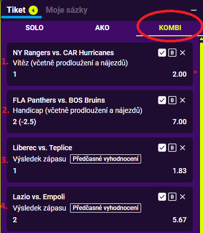 Zde vidíš tiket se 4 příležitostmi. Nyní si můžeš vybrat, jaké a kolik kombinací chceš využít.