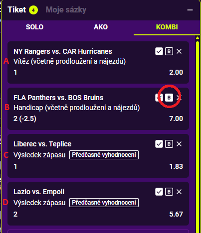 Zaškrtnutím boxu "B" vsadíš pouze na kombinace, který obsahují daný zápas. Pokud tedy box "B" zaškrtneš u zápasu C, pak sázíš jenom na kombinace s tímto zápasem, konkrétně 2-AKO (AC,CD,CB), 3-AKO (ACD,BCD.ABC), 4-AKO (ABCD) plus SOLO zápas C.