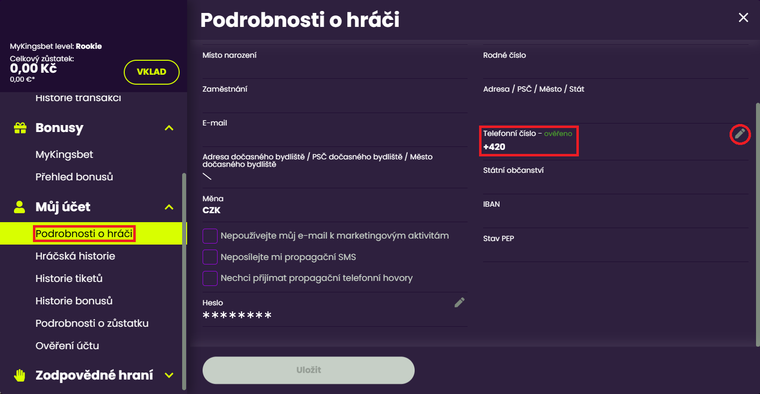 Pokud tento postup není možný, kontaktuj z nového telefonního čísla naši zákaznickou podporu na čísle: +420 910 920 555 (každý den 10:00 - 22:00). Pro změnu je nutné mít v profilu zadané platné číslo dokladu totožnosti.
