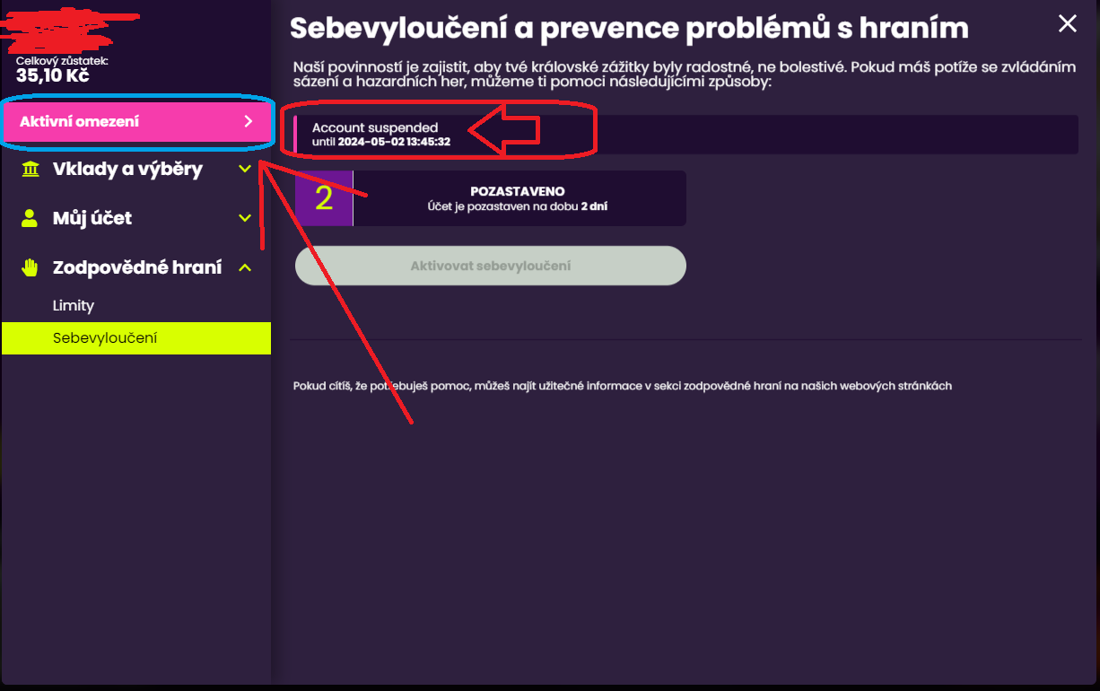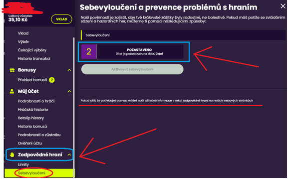 Po levé straně sjeď dolů na kategorii "Zodpovědné hraní", poté klikni na "Sebevyloučení" a hned uvidíš nabídku pro pozastavení účtu na 48 hodin (2 dny).
