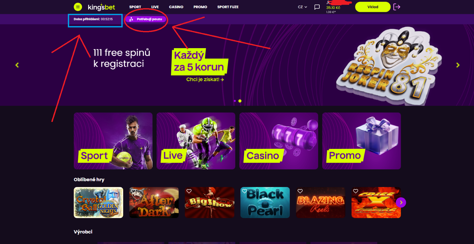 2) Můžeš aktivovat sebevyloučení na hlavní stránce Kingsbetu.