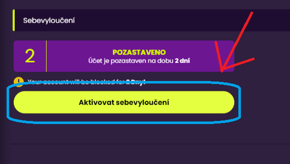Po zvolení této možnosti klikni na tlačítko "Pozastaveno" a poté aktivuj sebevyloučení.