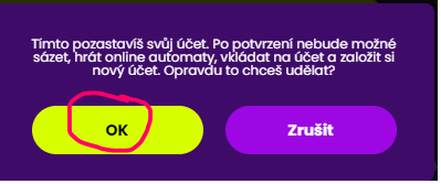 Ještě před zablokováním se ti ukáže výstraha, že pozastavuješ účet. Klikni na "OK" a poté se tvůj účet zablokuje a nebudeš moct sázet, hrát, vkládat a zakládat nový účet po dobu 48 hodin.