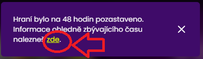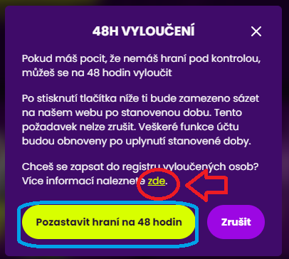 Poté se zobrazí okno s informacemi ohledně sebevyloučení a odkaz na registr vyloučených osob od Ministerstva financí, když má na tebe hraní špatný dopad, tak se můžeš zaregistrovat do rejstříku sám (RVO-Rejstřík vyloučených osob). Ovšem pokud chceš pozastavit svoje hraní jen na 48 hodin, klikni na tlačítko "Pozastavit hraní na 48 hodin" a poté je tvůj účet zablokován.