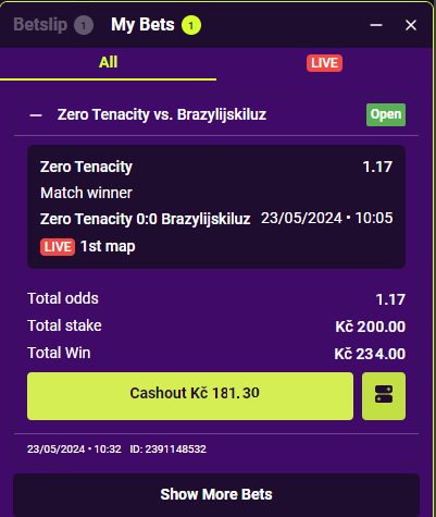 You bet 200 CZK on a team you think will win the match. During the match, it becomes clear that it probably won't go according to your expectations, or you're simply worried that you will loose the bet. Therefore, you can use Cashout, and get part of your money back, specifically 181.30 CZK.