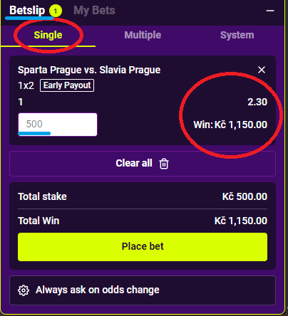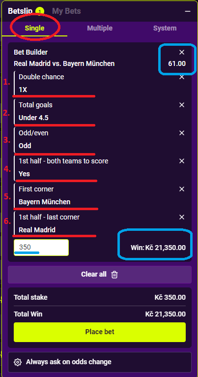 - Bet on individual combinations: You can choose how much money you want to bet on each combination. For example, 100 CZK on 2-Combo, 200 CZK on combination...