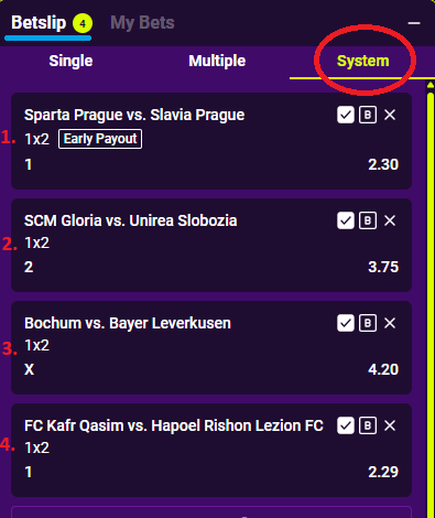 Here you can see a betslip with 4 selections. Now you can choose which and how many combinations you want to use.