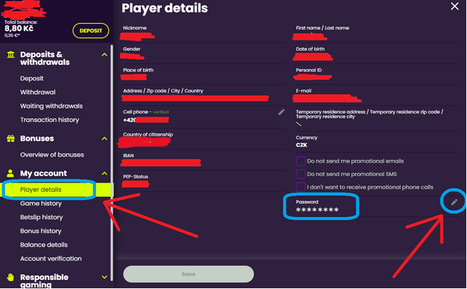 Changing personal data in your profile: Go to the "My account" section (click on your username in the top right corner) and then go to "Player details". You will find all your personal information here.