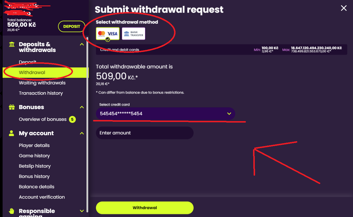 The minimum withdrawal amount is 1 CZK for bank transfer, 100 CZK for payment card.
